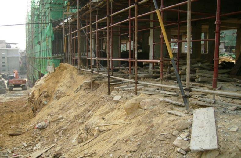 该基坑为深基坑工程_基坑周边堆放钢材等材料,易造成基坑坍塌等危险_该基坑支护采用土钉墙支护
