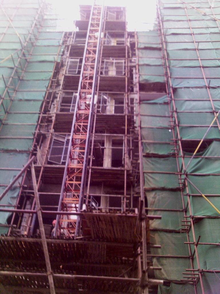 上图为外脚手架与施工电梯卸料平台图片,下列关于卸料平台搭设说法正确的是()。