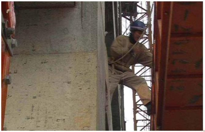 C. 作业人员在悬空处上下篮筐