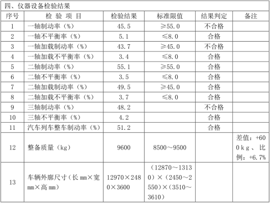 (问答题)以某并装轴重型厢式半挂车的注册登记安全检验为例(出厂合格证登记整备质量为9000kg,外廓尺寸为13000mm×2500mm×3560mm),依据GB 38900-2020和GB 7258-2017在表格中空白处填写标准限值或结果判定。