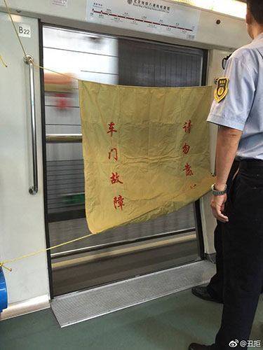 (案例题)2017年8月23日,某城市地铁列车车门发生故障,故障长时间未能解除,为减少对运营的影响,工作人员在车门处悬挂了“车门故障,请勿靠近”的布帘遮挡,车门旁配备值守人员后,列车继续行驶,如下图所示。